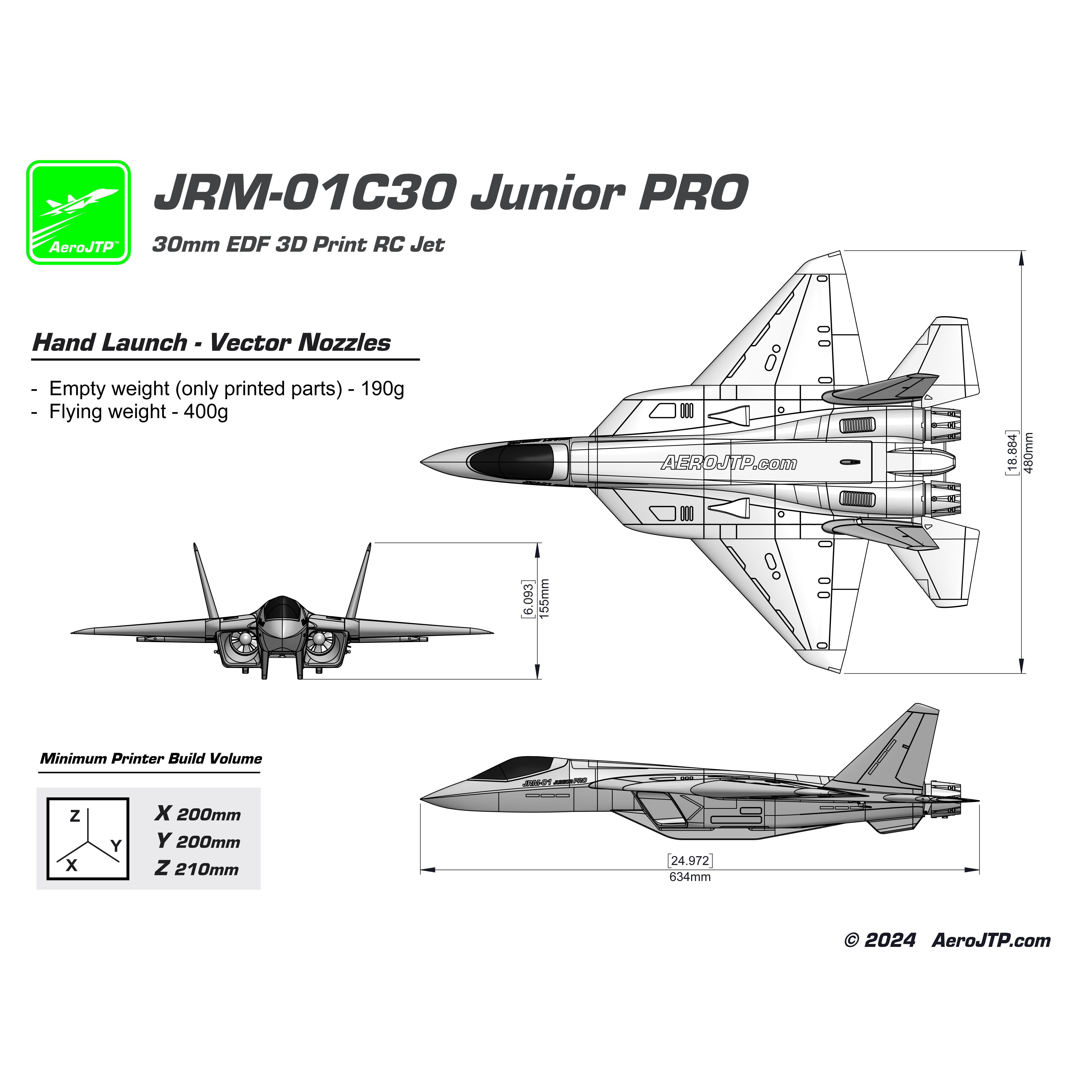 The JRM-01C30 Junior PRO has additional Yaw Vector controls for aerobatic maneuvers and trick flights.The JRM Junior Series is an easy to print and quick to build RC entry level jet.